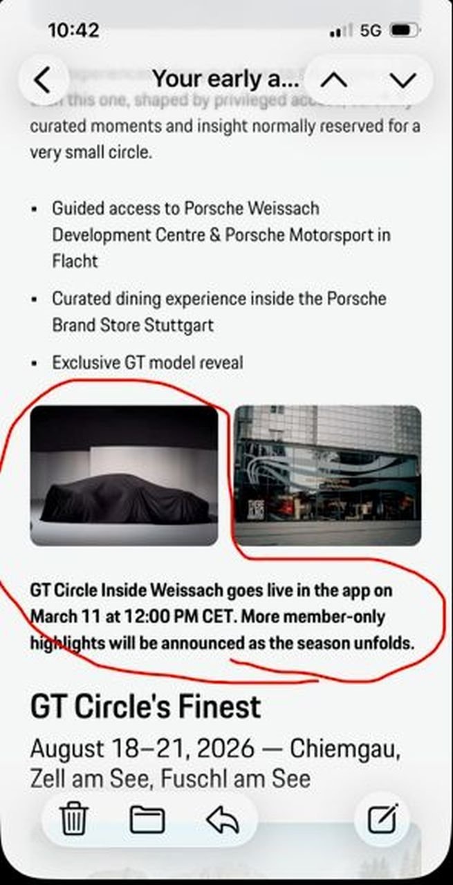 A Rennlist forum member has shared a screenshot of an email, which hints at the launch of an “Exclusive GT model” on March 11, 2026. The email also includes a teaser image featuring the car under a black cover.